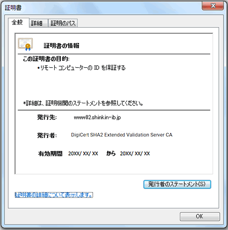- 暗証番号(パスワード)を入力するページは、ウィンドウに鍵のマークを表示しております。鍵のマークをクリックし、証明書が以下のとおりになっていることをご確認ください。