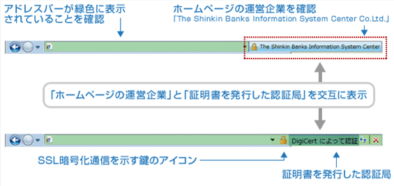 - 暗証番号(パスワード)を入力するページのアドレスバーが緑色に表示されていることをご確認ください。
